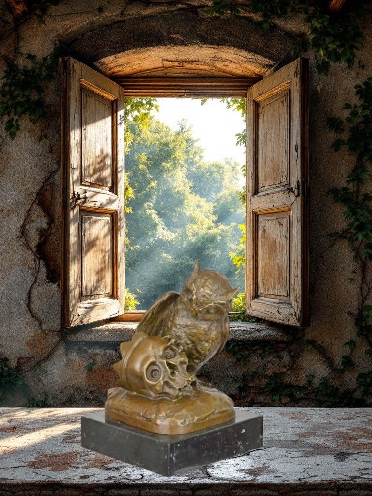 Sculpture en bronze : Hibou avec un crâne