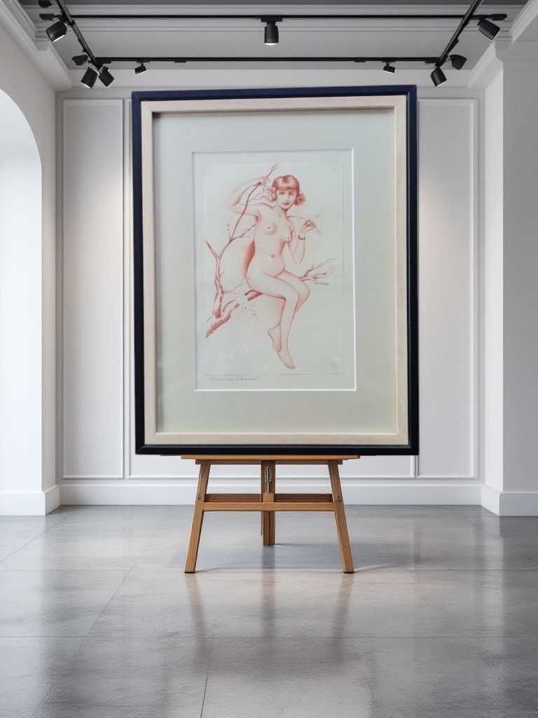 TAE11. Aquarelle jeune fille sur un arbre : Dimension avec cadre: 35x29 cm et Visu : 23x17 cm et signé: Lechamp